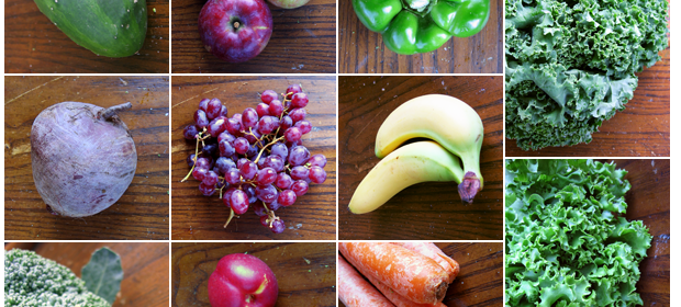 Week 4 of our organic produce delivery was delivered on September 2, 2009. The contents of the box included – 1 head of broccoli, 1 large local beet, 2 local cucumbers, 3 local nectarines, grapes, 3 local apples, 5 carrots, 2 bananas, 1 local green pepper, green leaf lettuce, and local kale.